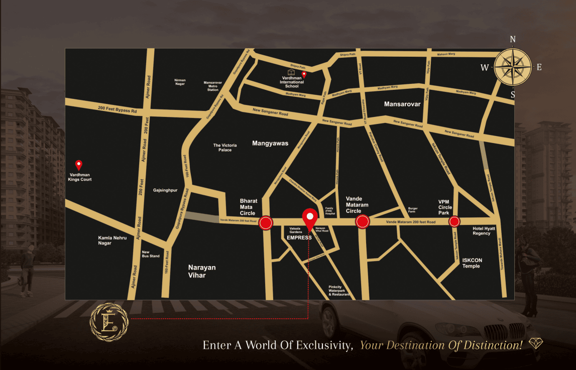 Located amidst the largest colony of Asia MANSAROVAR, Vardhman Eminara offers- superb connectivity to all civic amenities, be it offices, shopping, recreation, education and healthcare facilities etc. Airport is just a matter of few minutes and metro station is nearby. Being on the lifeline or the central -spine of Mansarovar – VANDE MATARAM ROAD, a 200 feet wide road connecting from Gopalpura By Pass and all the way to Sanganer, traffic jams wont worry you, Weather you are commuting to work or enjoying a leisurely weekend, you will- find everything you need, just minutes away.